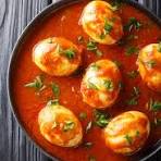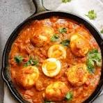 Boiled eggs in tomato-onion gravy, mild, tasty, homely, comforting.