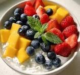 Dahi with fruit pieces, sweet, smooth, tasty, cooling.